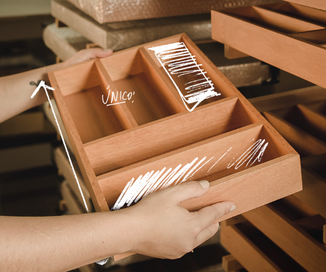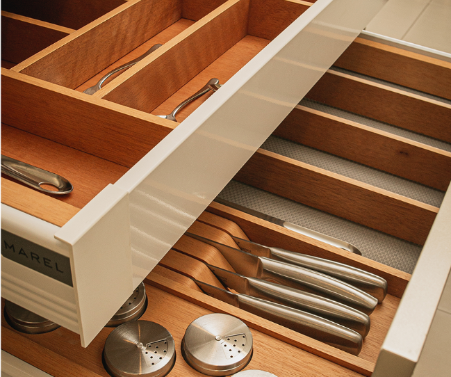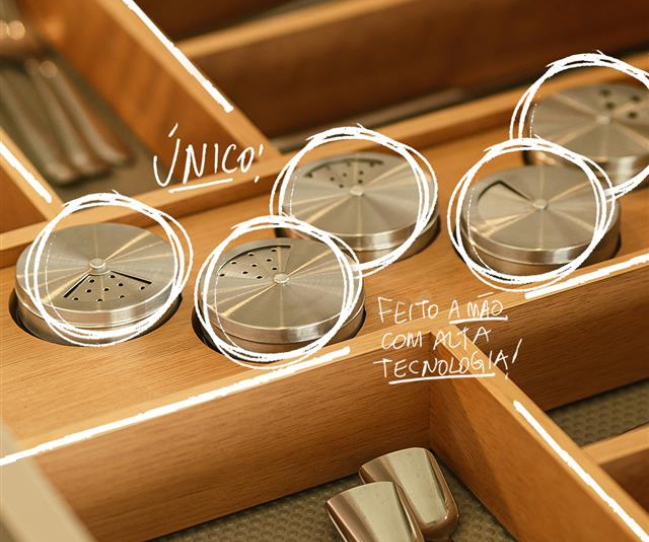 Além disso, no momento da configuração da gaveta no sistema, é possível selecionar e substituir os agregados por divisores ou organizadores conforme a necessidade do projeto.